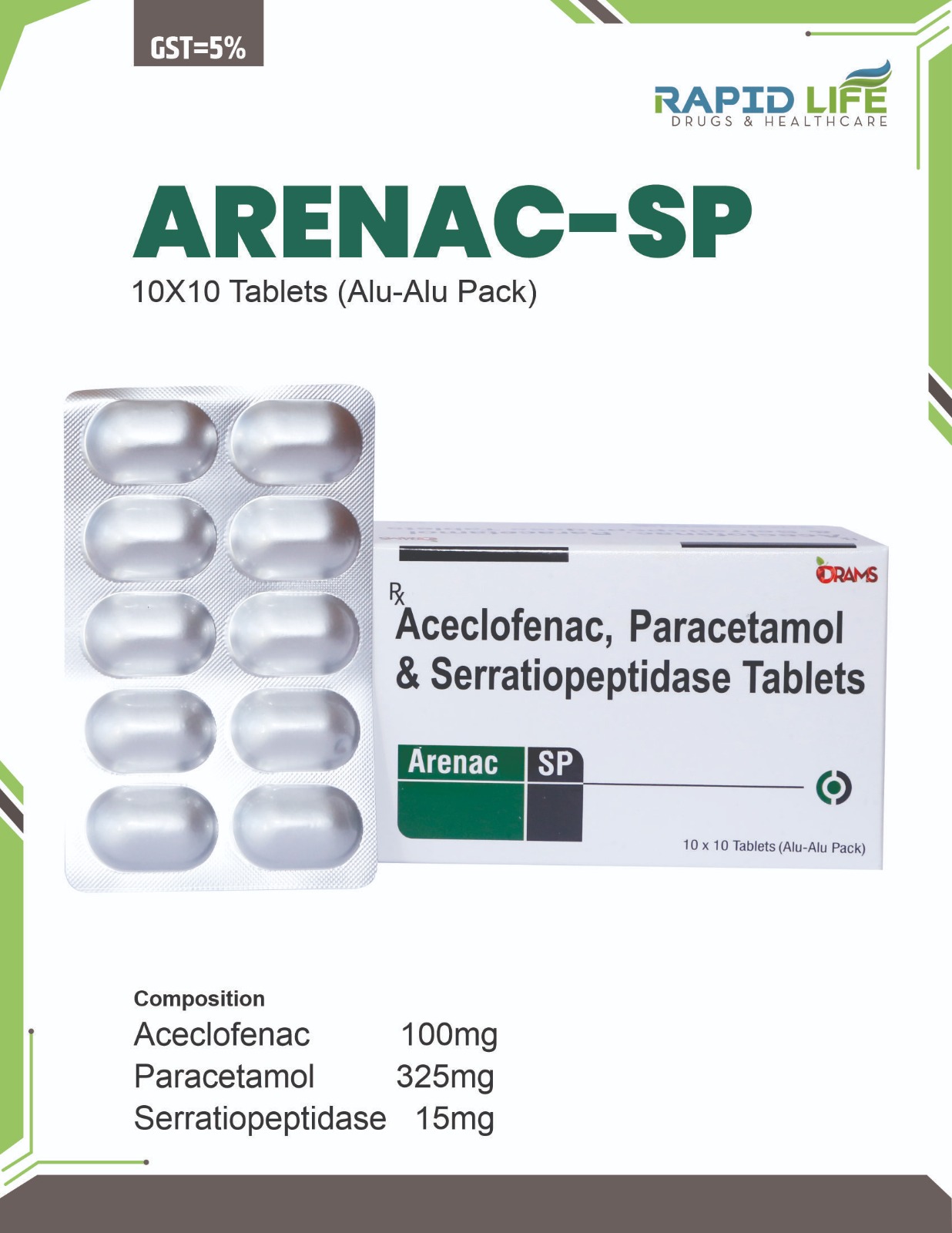 | Composition | Composition (Each tablet contains): Aceclofenac – 100 mg Paracetamol – 325 mg Serratiopeptidase – 15 mg Tablets |