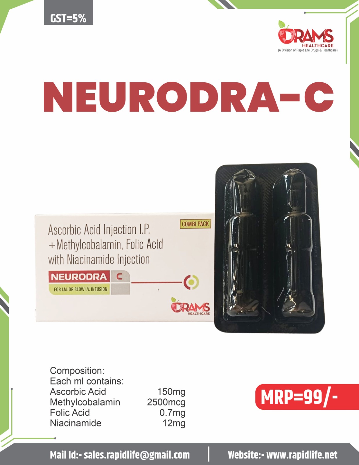 Composition Ascorbic Acid: 150 mg Methylcobalamin: 2500 mcg Folic Acid: 0.7 mg Niacinamide: 12 mg Injection