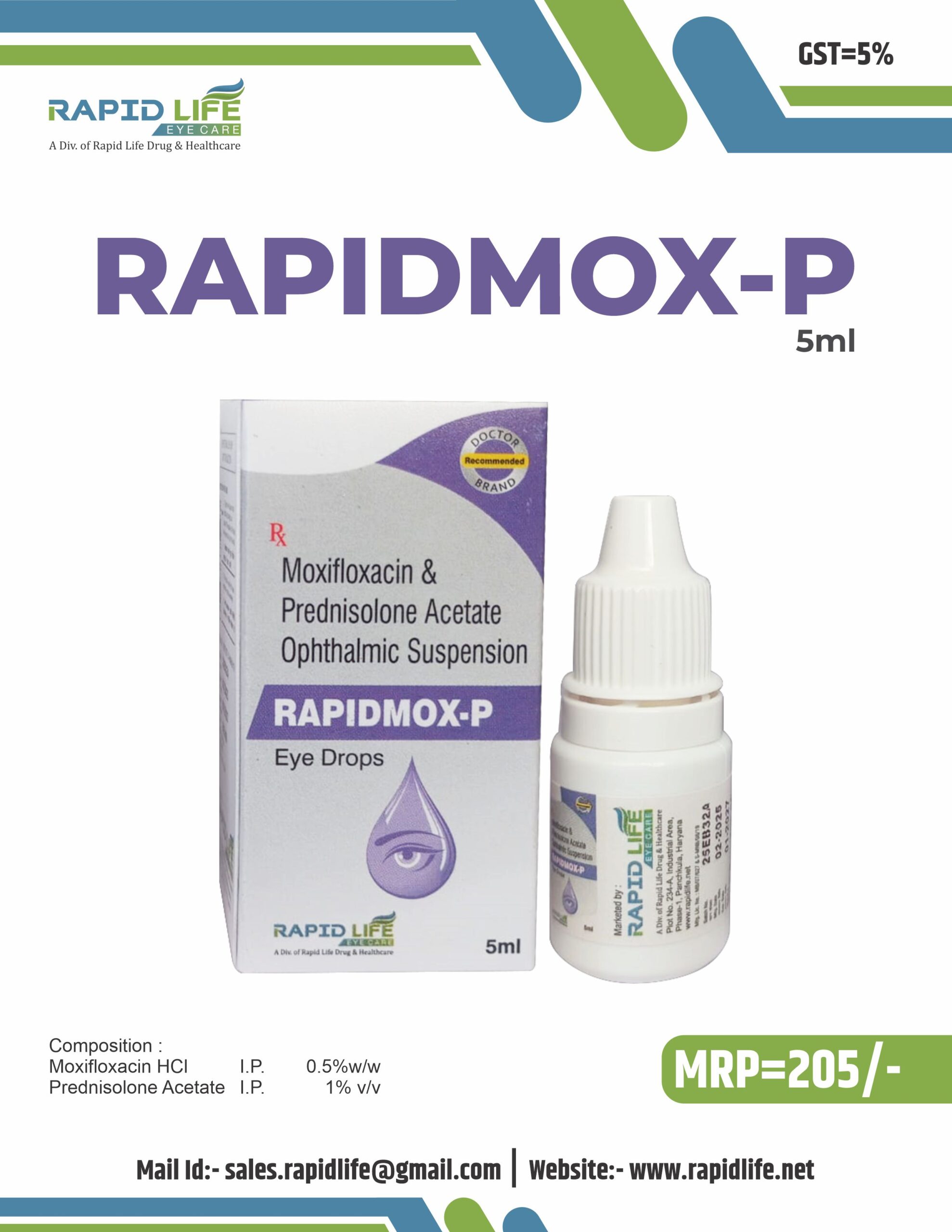 | Composition | Moxifloxacin hydrochloride 0.5 w/v & prednisolone acetate 1% w/v eye drops |