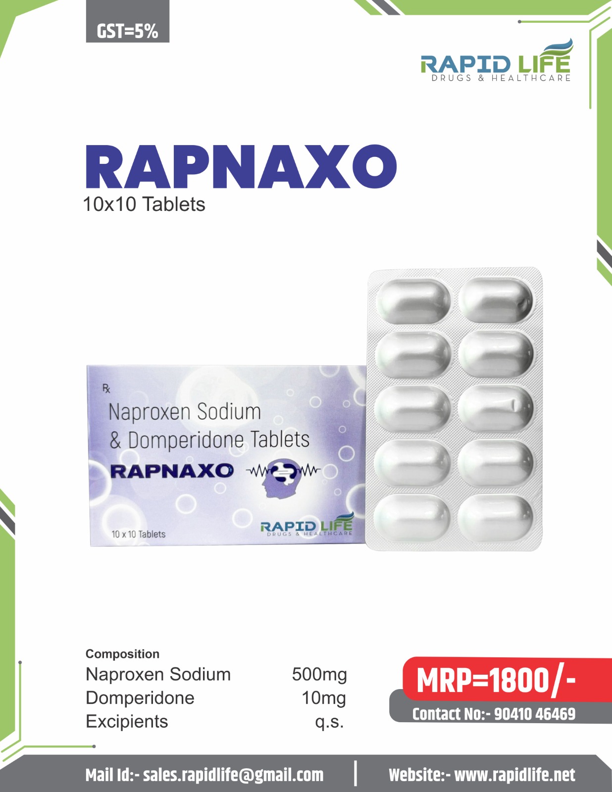 | Composition | Naproxen Sodium 500mg Domperidone 10mg Tablets |