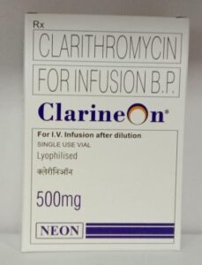 - Clarineon Injection includes ‘Clarithromycin’, which acts by killing the bacteria that lead to infection by inhibiting the formation of vital proteins required for bacterial survival.